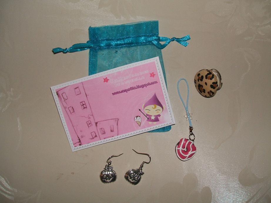 Dentro de esta bolsita preciosa, venía:- Unos pendientes muy orinales en forma de calabaza.- Un colgante para el móvil con el diseño de una rosquilla.- Y un anillo precioso.