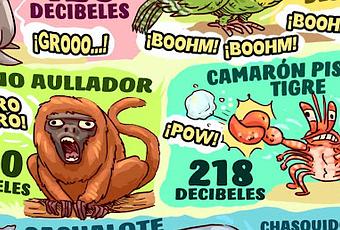 đŸŚœ Animales mĂĄs ruidosos đŸŚ€230 Decibelios: Chasquido del Cachalote.218 dB: CamarĂłn pistola tigre.140 dB: Mono Aullador.132 dB: Loro Kakapo126 dB: Elefante Marino.