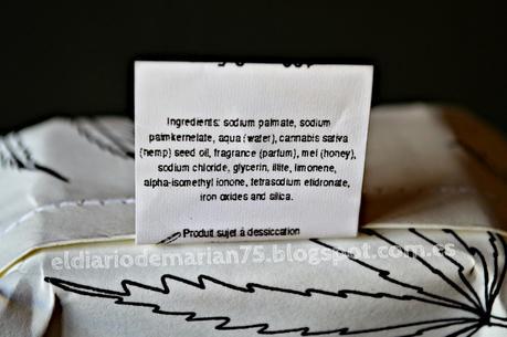IngredientesSodium Palmate, sodium palmkernelate, aqua, cannabis sativa (hemp) seed oil, fragance, mel (honey), sodium chloride, glycerin, illute, limonene, alpha-isomethyl ionone, tetrasodium etidronate, iron oxides and silica. Jabon 100% vegetal, sin colorantes ni parabenos. No testado en animales.