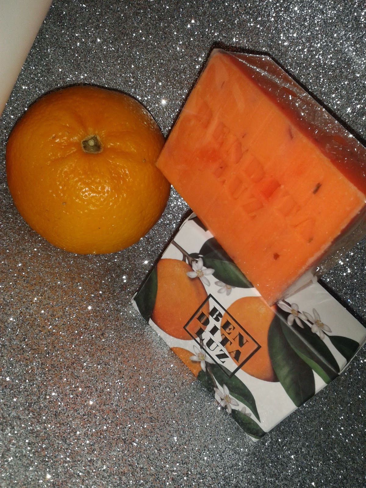 Jabón de naranja, olivo y pétalos de AzaharEsta sencilla pastilla de jabón me ha sorprendido muy gratamente, ya que también actúa como un excelente desmaquillador facial y como un exfoliante corporal.Su composición es natural con una alta concentración de aceite de naranja amarga proporcionando hidratación y luminosidad en la piel.Deja la piel suave y libre de impurezas gracias a sus pétalos de azahar que limpian la piel en profundidad. Además, previene la primeras líneas de expresión.Al igual que la loción, contiene vitamina E para prevenir el envejecimiento cutáneo.La pastilla es de 100 gramos, y cunde muchísimo.