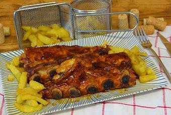 Os explico lo que yo hago, por la mañana temprano dejo la costilla con la salsa barbacoa en la fuente de horno en la nevera para que coja bastante sabor, cuando llego del trabajo, lo meto en el horno y mientras que se va haciendo, pelo, corto y frio las patatas y listo ya lo tengo.