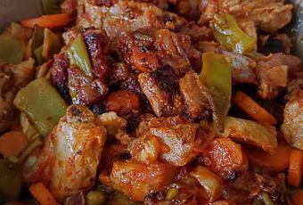 Retirar de la cazuela y reservar la costilla en una fuente y la cazuela con el aceite sobrante.