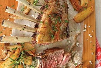 3. Sazona el rack con sal de mar y la pimienta. Séllalo con el aceite en una sartén del lado de la grasa. Hornéalo con las especias restantes por 20 minutos y sírvelo en una tabla con las papas.