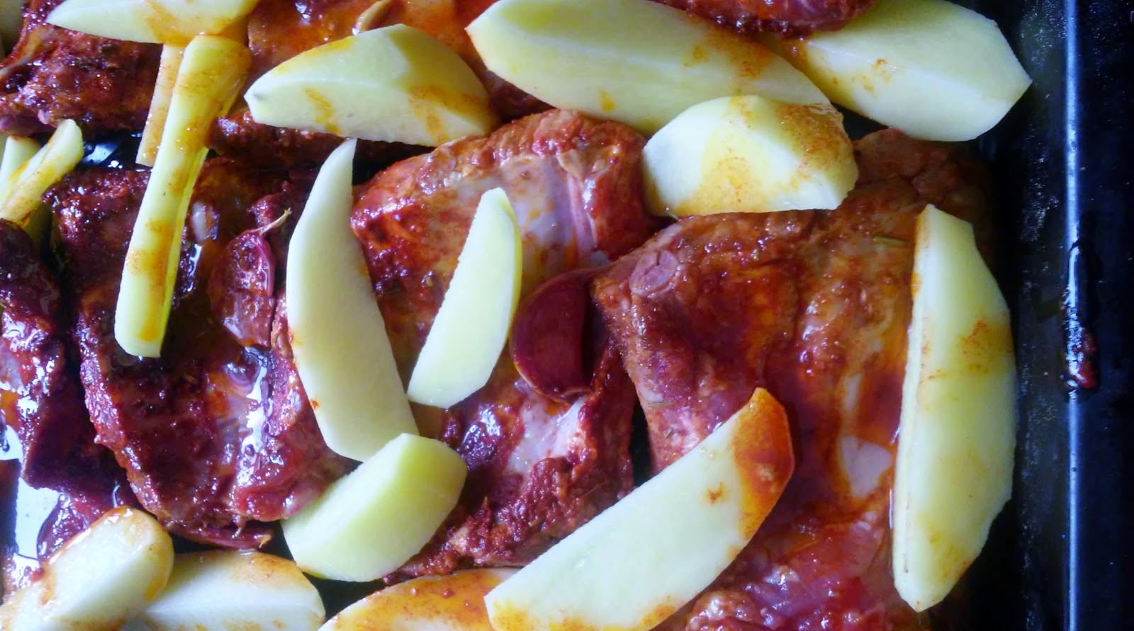 1 k. y 1/2 de costillas de cerdo1 limón2 cucharadas de Pimentón Dulce de la Vera2 cucharadas de azúcar moreno2 cucharaditas de romero seco2 cucharaditas de régano4 dientes de ajo enteros3-4 cucharadas de aceite de olivasal4 patatas grandes