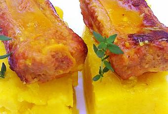 Servimos. Yo las he presentado triturando las patatas para hacer unos moldecitos y encima las costillas con una ramita de tomillo fresco.