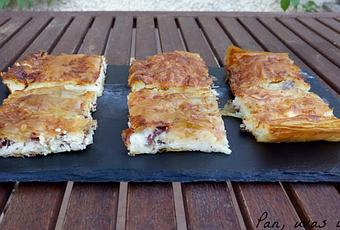 Una vez que hemos puesto la última hoja de masa filo, hacemos unos cortes, dibujando un damero, en toda la costrada que después nos ayudarán a separar las porciones.