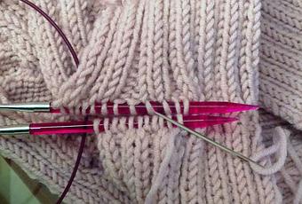 Inicio: Con el hilo de costura en la aguja trasera, pasar por el punto 1º de la aguja de delante como si tejiésemos del revés, después en el 1º de atrás del derecho.
