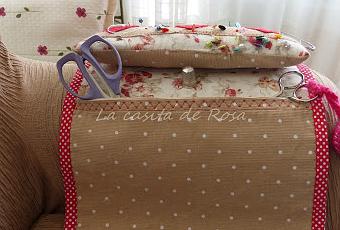 Con algunos retalillos me he hecho este costurero de tela con alfiletero para tenerlo en el brazo del sillón.