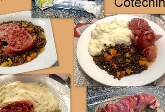 El cotechino con lentejas, es un plato típico del menú de la fiesta de Navidad, especialmente en la víspera de Año Nuevo, es tradición comer una porción con lentejas, antes de la media noche, es un buen presagio para el nuevo año. También se puede acompañar de un puré de patata espeso, como es tradición en Módena. O ambas preparaciones como en muchos otros sitios.