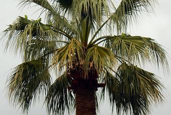 Piaban de forma muy ruidosa y hemos levantado la mirada. ¡Qué pájaros tan bonitos! Son de color verde…Incluso ha habido un comentario de experto : deben ser una especie tropical y en esa palmera han encontrado lo más similar a su entorno.