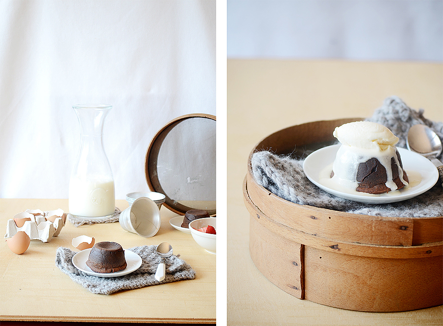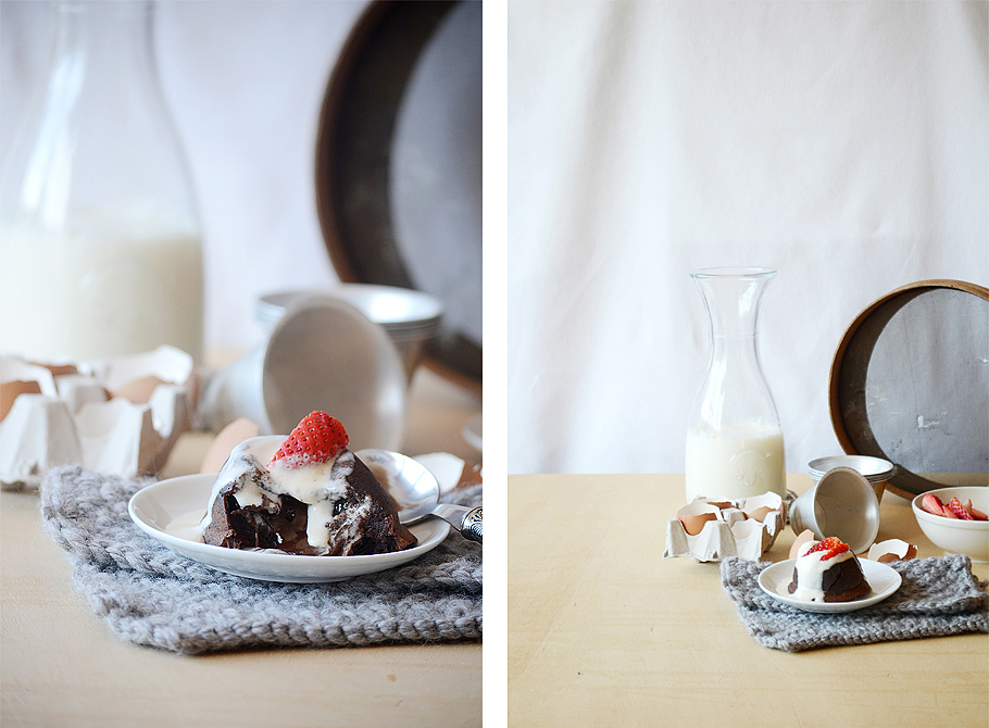 Una vez hecha la mezcla la vertemos directamente en los moldes previamente untados de mantequilla o spray desmoldables. Horneamos 7 minutos y desmoldamos con mucho cuidado directamente sobre el plato donde lo vayamos a servir.