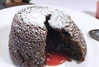 Se vierte una parte de masa y se incrusta una porción de sirope de fresa para terminar de rellenar el molde con mas masa de coulant.