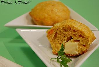 4.- Ponemos un poco de nuestra masa en el fondo de los moldes. Colocamos un dado de queso Gouda y volvemos a cubrir con la masa hasta arriba. Introducimos al horno 25 minutos a 180º. Mis moldes son de silicona y no se pegan pero si usáis otros moldes tenemos que poner mantequilla y un poco de harina para que no se pegue.