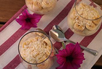 Para montar las copas pondremos una cantidad generosa del cous cous, a continuación unas rodajas de plátano y finalmente espolvorearemos el coco rallado por encima.