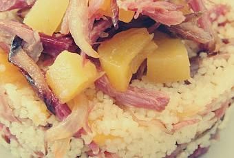 Seguro que much@s de vosotro@s cuando habéis leído cous-cous habéis pensado en comida oriental y muy especiada. Suele ser así pero no es el caso de esta receta. Se trata de una receta de cous-cous con el punto sofisticado del confit y un sabor delicado. ------- Probably most of you have thought about exotic and spicy food after reading cous-cous. Usually it's true...but not this time. This is a cous-cous recipe whith the little sophistication of the duck confit and a delicated taste.