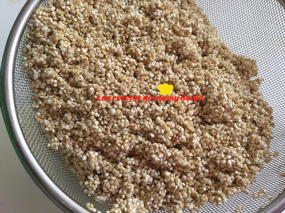 Ponemos la quinoa en un colador y lávala con agua fría. Escúrrela muy bien para que se seque lo máximo posible.