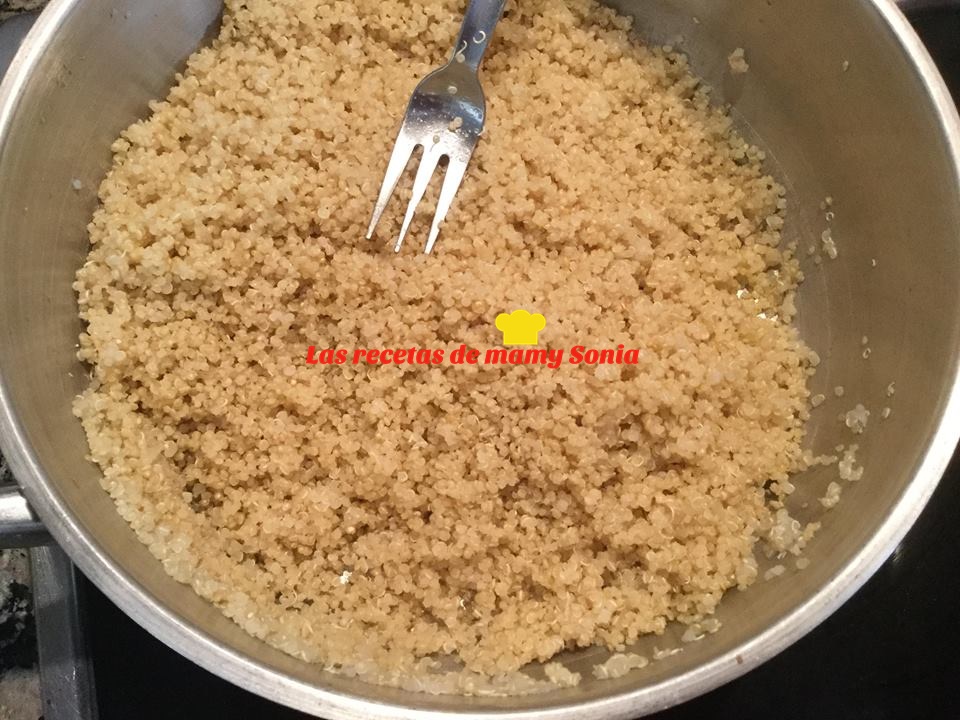Destapamos la quinoa después del tiempo de reposo y removemos con un tenedor, como si fuese couscús, para que no se apegotone y quede esponjosa y tierna.