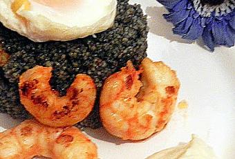Con cuidado retiramos el papel film y los colocamos sobre el cous cous. Añadimos 3 gambones por persona que habíamos reservado. Y servimos acompañado de alioli. Ya veréis al romper el huevo que contrastes de sabores!!