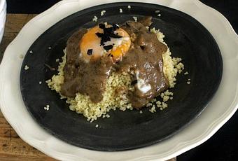 Escalfas el huevo en agua hirviendo con un poco de vinagre. Para servir, deberás poner una base de repollo, el cous- cous, la salsa de trufa, el huevo (yo le he quitado un poco de clara). Espolvoreas con el resto de la trufa y un poco de sal.