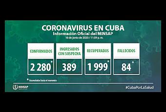 Al cierre del día de ayer, 16 de junio, se encuentran ingresados en hospitales para vigilancia clínica epidemiológica 389 pacientes. Otras 824 se vigilan en la atención primaria de salud.Para COVID-19 se estudiaron 2 mil 320 muestras resultando siete muestras positivas. El país acumula 141 mil 151 muestras realizadas y 2 mil 280 positivas (1,6%). Por tanto, al cierre del día de ayer se confirman siete nuevos casos, para un acumulado de 2 mil 280 en el país.