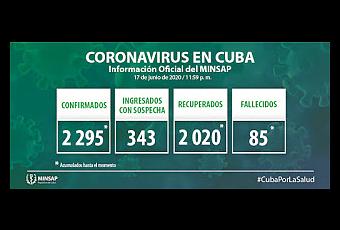 Al cierre del día de ayer, 17 de junio, se encuentran ingresados en hospitales para vigilancia clínica epidemiológica 343 pacientes. Otras 919 se vigilan en la atención primaria de salud.Para COVID-19 se estudiaron 2 mil 582 muestras resultando 15 muestras positivas. El país acumula 143 mil 733 muestras realizadas y 2 mil 295 positivas (1,6%). Por tanto, al cierre del día de ayer se confirman 15 nuevos casos, para un acumulado de 2 mil 295 en el país.