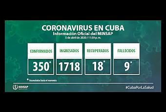 Al cierre del día de ayer, en Cuba se encuentran ingresados para vigilancia clínico-epidemiológica mil 718 pacientes. Otras 18 mil 434 personas se vigilan en sus hogares, desde la Atención Primaria de Salud.Para COVID-19 se estudiaron 764 casos, resultando 30 muestras positivas. El país acumula 5 mil 998 muestras realizadas y 350 positivas. Por tanto al cierre del día de ayer se confirmaron 30 nuevos casos, para un acumulado de 350 en el país.