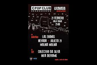 El Cpop Club llega a Granada con un evento lleno de sorpresas con cuatro directos y dos dj sets desde la Sala Vogue.El 21/2 en la Sala Vogue de Granada se planteará un evento bajo la firma del Cpop Club con muchas sorpresas.Los directos acústicos serán de Las Dianas, Nevada, Molina Molina y Julieta 21, cuatro propuestas musicales que llevarán su show a la mínima expresión instrumental. Se suman los dj sets de Colectivo Da Silva y de Nita Deframe para completar la jornada. La fiesta es el Cpop Club, una forma de llevarnos al festival del momento con sabor a pop.