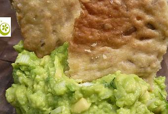 Para el dip, abrimos los aguacates, les retiramos la carne. Picarlo con un cuchillo. Añadir el ajo machacado, la cebolleta y las hierbas picadas. Regarlo con el zumo de limón . Mezclar bien, rectificar de sal y srvirlo rodeado de las crackers.