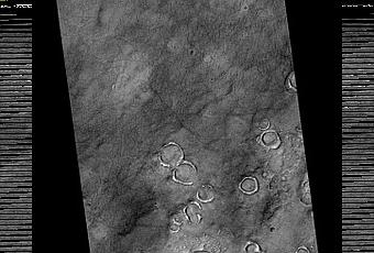 Panorámica general de la zona, donde se puede apreciar la irregularidad de las formas de los cráteresLos astrónomos estiman que estas formas tan irregulares pueden obedecer a la presencia de hielo de agua cerca de la superficie. Algunos cráteres parecen viejos y erosionados, mientras que otros parecen estar rellenos de material que podría contener hielo.