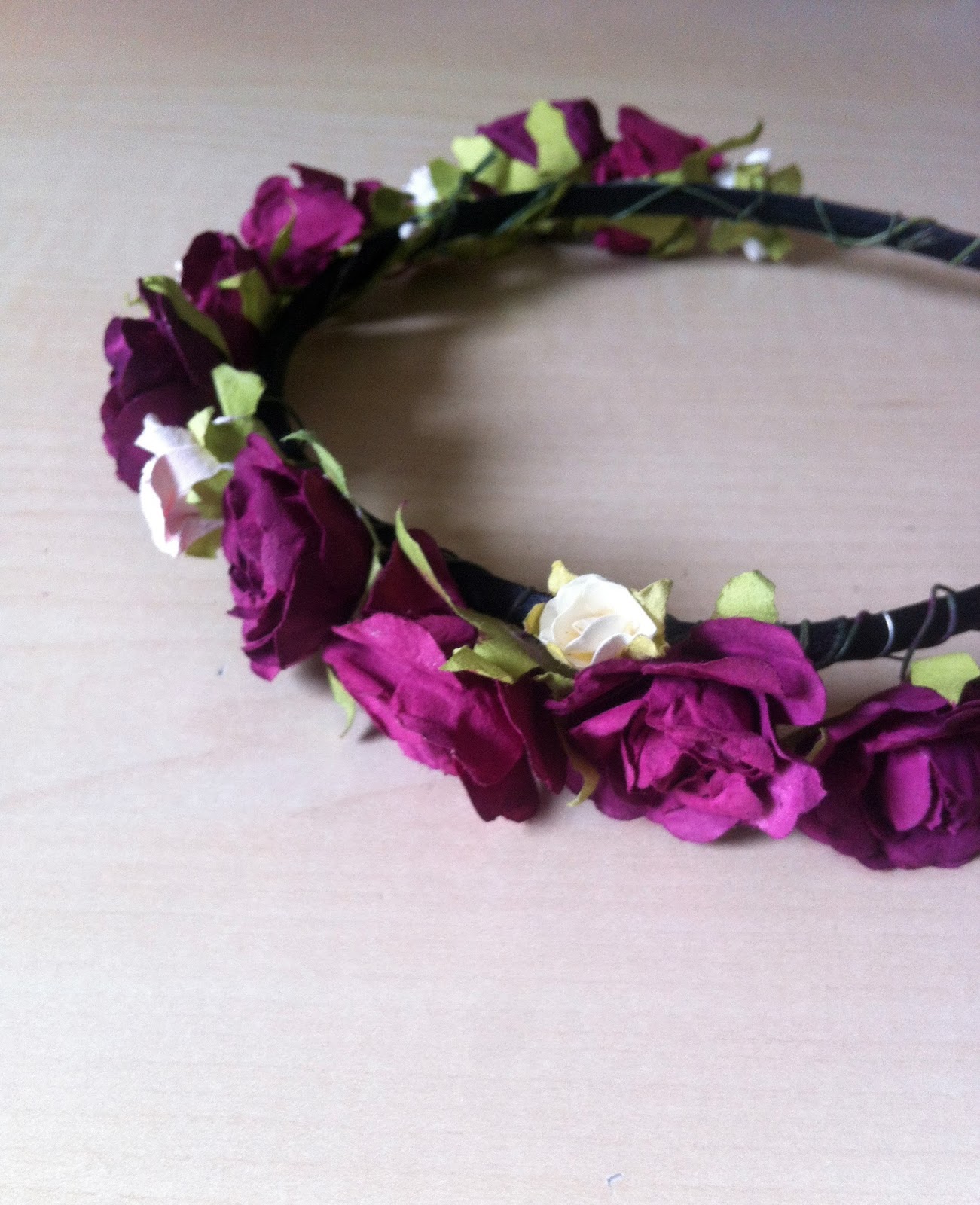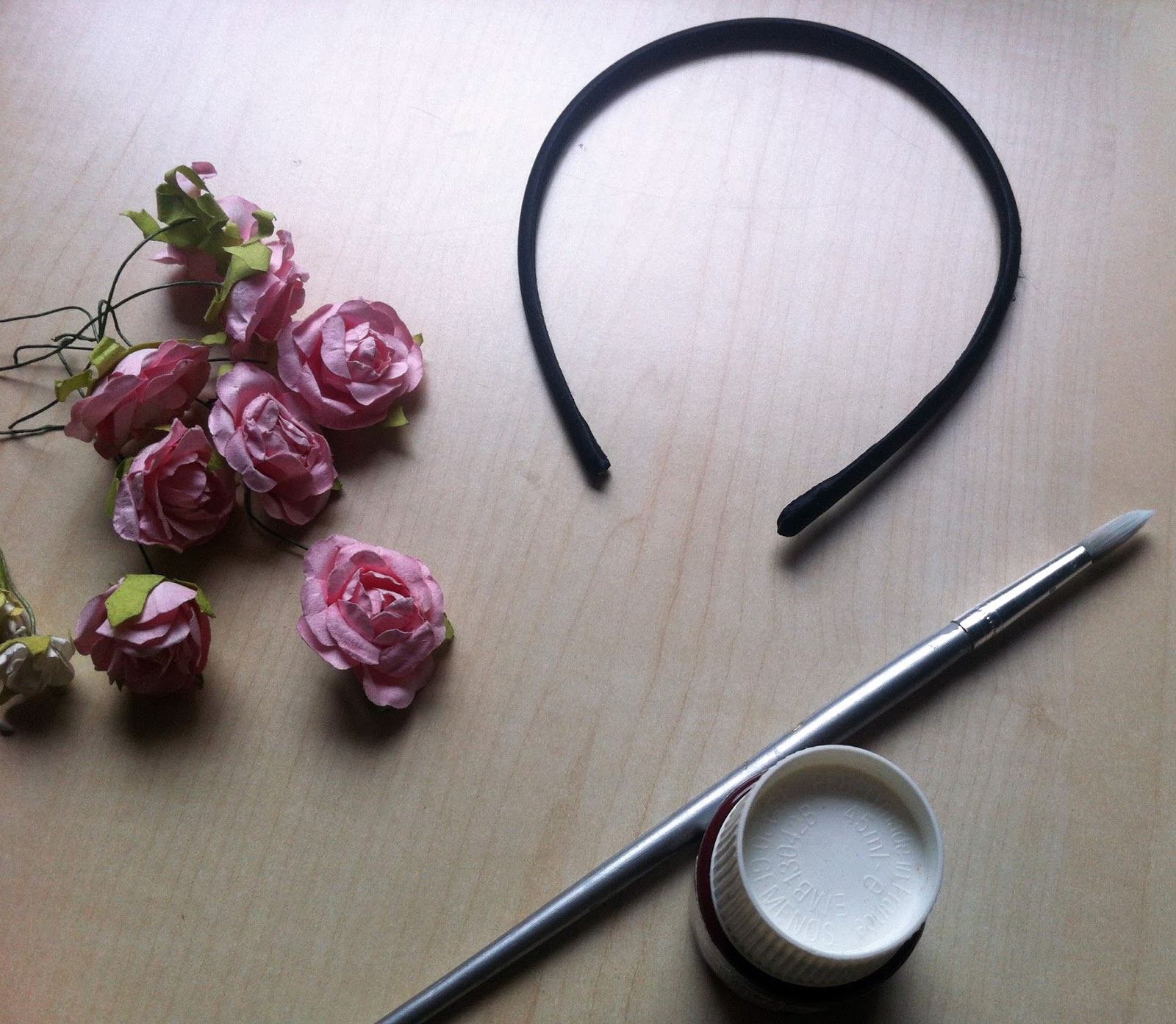 Lo primero que tendréis que comprar son unas flores de papel del tamaño elegido y que tengan el tallo de alambre. Las podréis encontrar en cualquier establecimiento de decoración. En nuestro caso fueron unas del chino, eran de color rosita claro y nos costaron 2,50€. Además necesitamos: una diadema (puede ser reutilizada, como en nuestro caso), pintura (acrílica, para tela...la que tengáis en casa que sea cubriente), pincel, pegamento de barra y una cinta del color de la diadema para cubrir los alambres en el extremo.