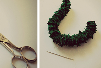 - Enhebramos una aguja grande con el hilo transparente y vamos introduciendo los cuadrados que hemos cortado y las bolas de madera. Colocamos las puntas de los cuadrados en diferentes posiciones para que no nos quede todo uniforme y darle diferente volumen al collar.