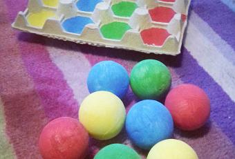 He utilizado témperas escolares para pintar el cartón de una caja de huevos, y compré en una juguetería educativa las bolas de poliespan de 4,5cm que tambié pinté.