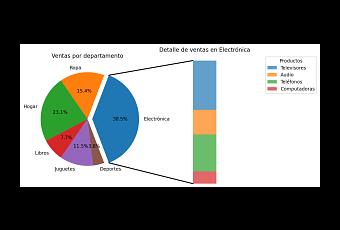 A la hora de representar datos complejos en los que existen categorías y subcategorías puede ser necesario mostrar la distribución general y el detalle de una categoría en específico. Por ejemplo, las ventas de una tienda por departamento y el detalle de un departamento en específico. Una opción para conseguir esto es combinar un gráfico de tarta, con la que se puede mostrar la distribución general de la tienda, con una barra aplicada en la que se puede detallar las ventas de uno de los departamentos. En esta entrada, se va a explicar por qué son interesantes estas representaciones y cómo crear un gráfico de tarta con subcategorías en Python con Matplotlib.