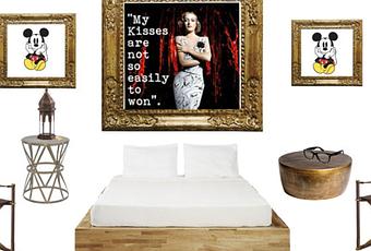 Pues con unas sábanas de hilo y almohadones fue cubierta ,unas mesas compradas en internet y 3 láminas dos de ellas sacadas de unas revistas de sus hijos y un trabajo mío llamado Kisses ,hicieron el resto,