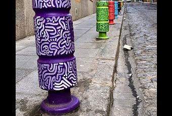 En esta ocasión se trata de simples bolardos, de los que impiden a los vehículos subirse para aparcar en las aceras, que fueron testimonios de anteriores décadas y que también alimentan a la creatividad que, en estos momentos, bulle por este barrio...