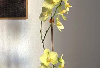 Está super alta, ya que en esta segunda floración la vara primera (que ya tuvo su floración) se alargó, de ella salieron 6 flores de las que quedan 4, también tiene una sub - vara con 6 flores, y hay una segunda vara más pequeña con las 3 flores (de hecho veis una que se está muriendo ya)