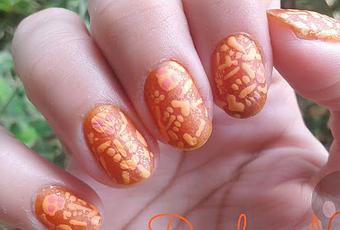 De base utilice un esmalte naranja con brillos plateados, esmalte que muy poco utilizo, así que esta vez me dije, "este te lo pones por que te lo pones" esmalte todas las uñas esperando que me llegara la inspiración, fue allí cuando me surgió la idea de hacer un tipo...ahmm... no se como llamarle, como que las uñas llevaran continuación como pueden ver, algo así como un escenario ¿se podría llamar así? Bueno ¡en fin! y para dejar de lado un poco el esmalte negro opte por utilizar un esmalte naranja más clarito. Por ultimo dí una capa de top coat para proteger el diseño y por ultimo aplique el matizador, ya que si aplico solo el esmalte mate, este me corre el diseño.