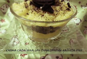 Paseando por los pasillos del super, sección refrigerados más exactamente, me topé con las famosas natillas con oreo. Bien !!! ya tenía mi fuente de inspiración. Aunque como me gustan bien espesitas las natillas, al final opté por utilizar la crema catalana que normalmente hago en casa.
