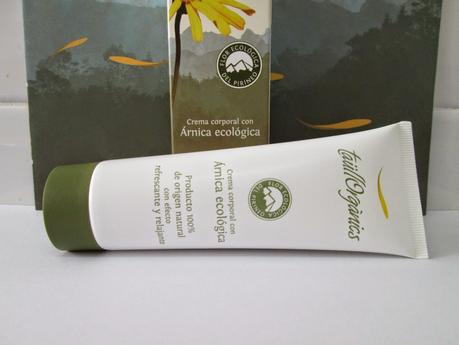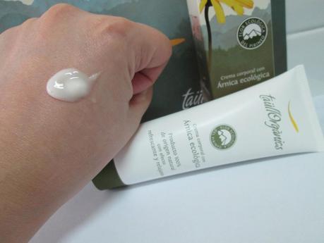 La "crema corporal con árnica ecológica" tiene una textura muy fluida y muy ligera, que se absorbe muy bien y es muy agradable al tacto. Es un producto que no contiene nada de parabenos ni derivados.