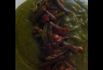 - Mientras tanto, lava las judías, quita las hebras que puedan tener, y córtalas en trozos pequeños. Cuece las judías en agua con sal durante 10 minutos. Escúrrelas.