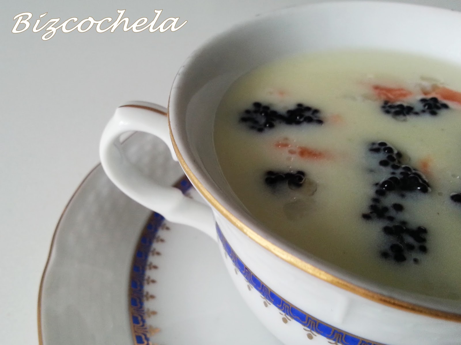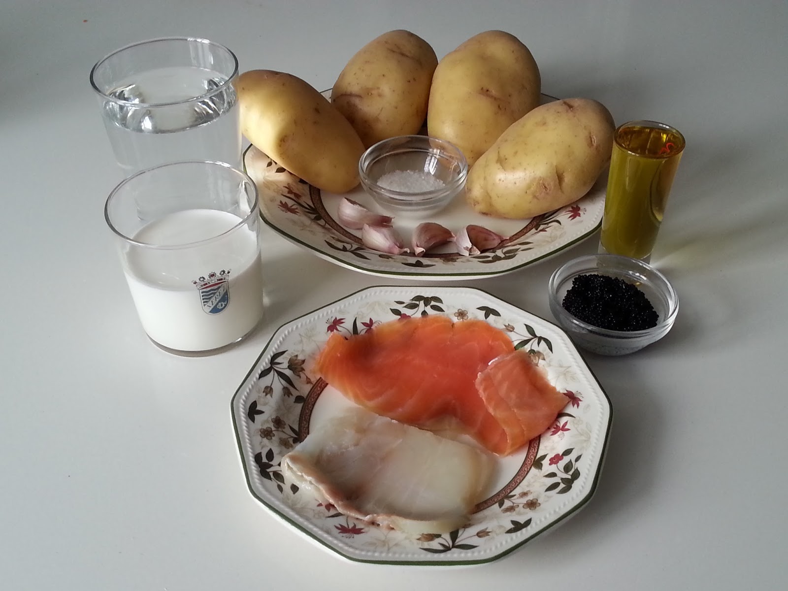 Un chupito de aceite de oliva unos 50 gr3 o 4 dientes de ajo grandes, unos 20 gr1 litro de agua1 kg. de patatas 2 y 1/2 pastillas de caldo de pescado o salPimienta recién molida200 ml de nata de cocina100 gr. salmón ahumado o 50 y 5 salmón y bacalao ahumado50 gr. de huevas de lumpo (o bolitas negras que le dicen mis hijos)