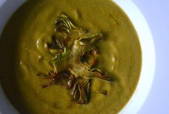 Puedes terminar la crema con unos croutons o con unos chips de alcahofa, simplemente corta la alcahofa cruda ya pelada muy delgada, enharinalos con harina especial para rebozados y fríe con abundante aceite