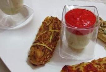 Acompañados de unos panecillos, son de tomate y queso, de pipas y de tomate, muy ricos todos.