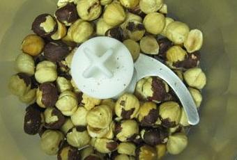 Picamos las avellanas en la picadora. Yo empleé de las que vienen ya tostadas y sin cáscara. Si las compramos con cáscara habrá que tostarlas en el horno a temperatura baja unos 10 minutos.