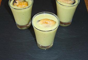 Servimos la crema en vasitos de chupito con un mejillón encima, o en cucharitas de aperitivo o en cuencos más grandes.