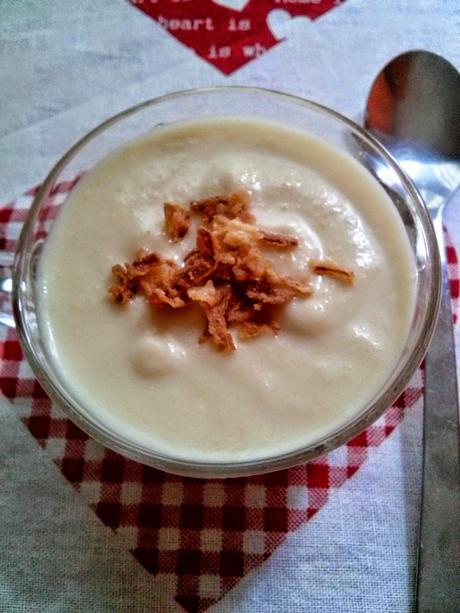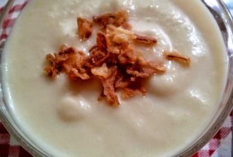 300 g. de melón ( peso sin cácara , sin pepitas )3 calabacines3 puerros1 cebolla1 patata pequeña100 g. de nata para cocinar400 g. de aguasalpimientacebolla frita crujiente50 g. de aceite de olivaPREPARACIÓN