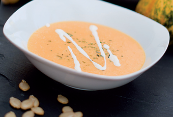 INGREDIENTES: Calabaza, Cebolla, Patata, Queso fresco (opcional), Agua, Sal, Aceite de oliva, Nata líquida, Alga Nori en copos, Pipas de calabaza.