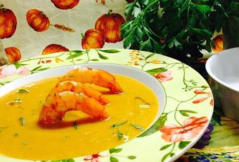 INGREDIENTES (para 4 raciones): 1/2 k de calabaza, 1 cebolla, 1 puerro, aceite de oliva, sal, 1 toque de pimienta, 16 langostinos, 1 diente de ajo o ajo en polvo, 1 cayena (opcional), sal y 1 vaso de agua.
