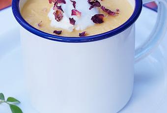 Picaremos la cebolla en cuadrados y la rehogaremos durante dos minutos en el aceite de oliva. Luego agregaremos la zanahoria , también pelada y cortada en trozos no muy grandes, y la rehogaremos unos cinco minutos. Agregaremos la calabaza y la patata, ambas sin piel y troceadas. Añadiremos el agua y dejaremos cocer unos 15-20 minutos o hasta que toda la verdura esté blanda. Salaremos. Retiraremos la mitad del caldo de cocción e incorporaremos 175 grms del queso de untar y trituraremos. Emplataremos y sobre cada plato, taza o tazón pondremos una quenelle de queso de untar. Finalmente espolvorearemos los pétalos de rosas.