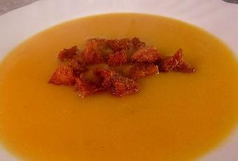 5.- Cuando esté lista, freímos pan del día anterior cortado en cubos. Una vez fritos lo servimos inmediatamente sobre la crema de calabaza